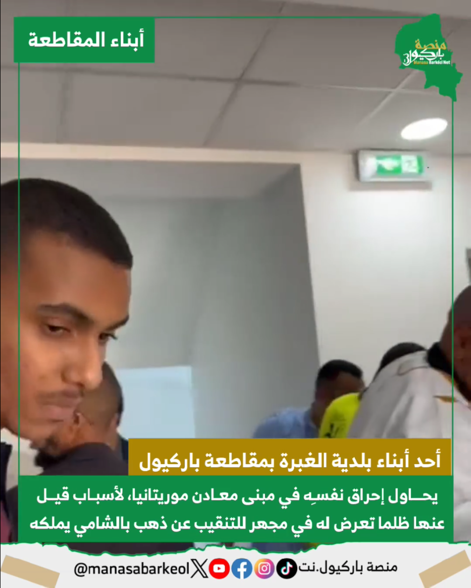 اقدم مواطن موريتاني ينحضر من بلدية الغبرة بمقاطعة باركيول، اليوم على محاولة إحراق نفسه بالبنزين في مبنى والوكالة الوطنية معادن موريتانيا، وذكرت مصادر ل منصة مقاطعة باركيول أن أسباب هذه الحادثة هو أساسا ظلما تعرض له الرجل منذ شهور ويتعلق الأمر بحاولة بعض النافذين انتزاع بئرا للتنقيب عن الذهب تعود ملكيته للرجل في الشامي، وأضاف ذات المصدر أن الرجل سبق أن كتب عدة رسائل للوكالة من أجل رفع الظلم عنه لكن لم يجد التجاوب المطلوب مع مطالبه ولم يتم رفع الظلم عنه، وهو ما دفعه اليوم لمحاولة حرق نفسه، داخل مبنى معادن موريتانيا
