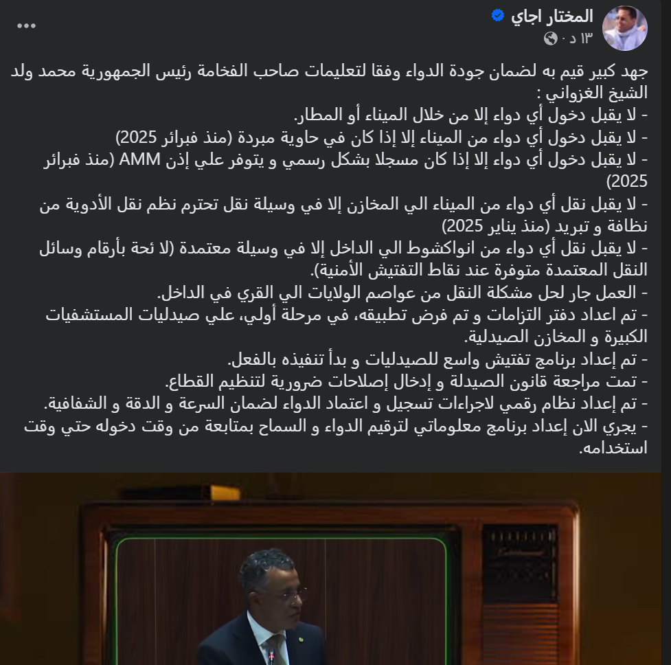 وأضاف أن نقل الأدوية من الميناء إلى المخازن، أو من نواكشوط إلى الداخل، يخضع لشروط صارمة تتعلق بالنظافة والتبريد، مع اعتماد لائحة رسمية بوسائل النقل المسموح لها بذلك، مؤكداً أن العمل جارٍ لمعالجة إشكالية نقل الأدوية من عواصم الولايات إلى القرى.