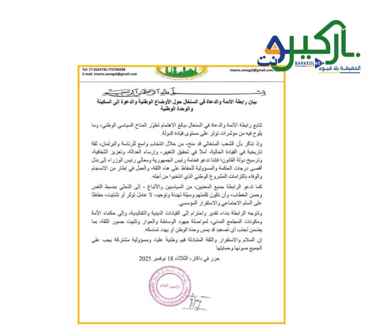 رابطة الأئمة والدعاة في السنغال تدعو إلى التهدئة وتعزيز الوحدة الوطنية بدل تصاعد التوتر السياسي
