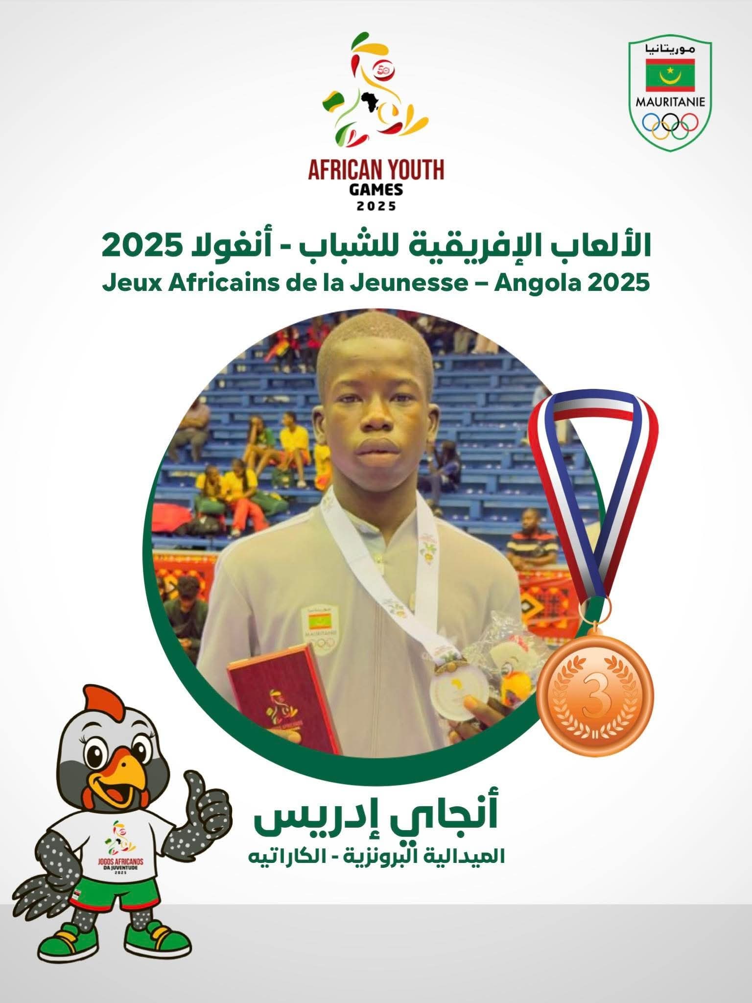 باركيول.نت (نواكشوط) وجه وزير تمكين الشباب والتشغيل والرياضة والخدمة المدنية، محمد عبدالله لولي، تهنئة إلى البطل الموريتاني الشاب أنجاي إدريس، بمناسبة إحرازه الميدالية البرونزية في منافسات الكاراتيه (وزن أقل من 55 كلغ – كوميتيه)، ضمن دورة الألعاب الإفريقية للشباب المقامة في أنغولا 2025.