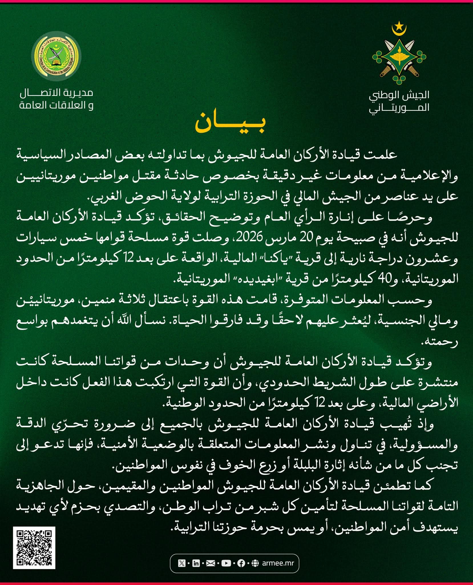 وأوضحت قيادة الأركان، في بيان صادر عنها، أن قوة مسلحة قوامها خمس سيارات وعشرون دراجة نارية وصلت صباح يوم 20 مارس 2026 إلى قرية “باكنا” المالية، الواقعة على بعد 12 كيلومترا من الحدود الموريتانية، و40 كيلومترا من قرية “أنفيديه” الموريتانية.